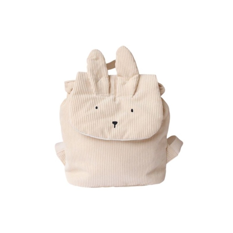 Tout doux et plein de charme, il séduit par sa matière en velours côtelé écru, et surtout par sa jolie tête de lapin aux longues oreilles adorables. À la fois pratique et craquant, il fera le bonheur des enfants dès l'entrée à la crèche ou chez nounou.
