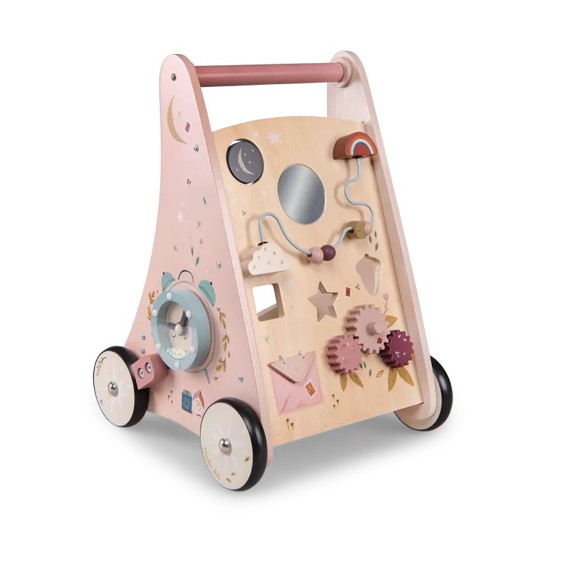 Chariot de marche antidérapant pour accompagner les premiers pas de bébé en toute sécurité. Décoré des illustrations poétiques de Lucille Michielli sur la nature, il dispose de 8 activités : labyrinthe coulissant, engrenages, encastrages,... Le kit de 3 formes ainsi que la pièce fond de chariot de marche, sont disponibles en pièces détachées.