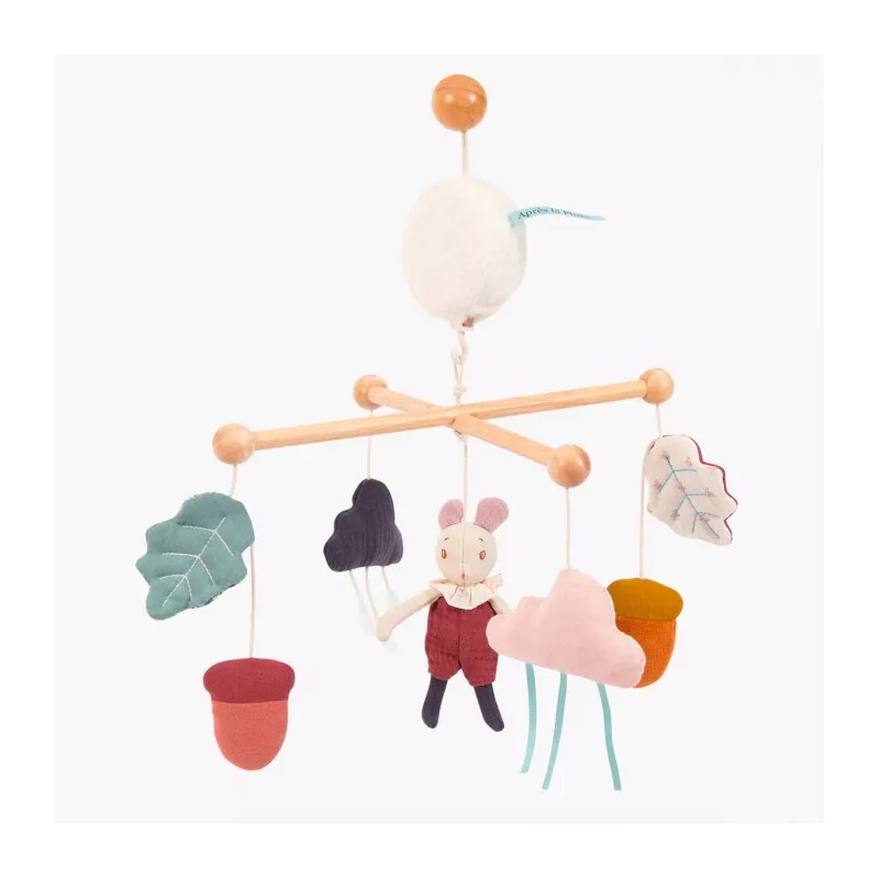 Mobile musical pour éveiller la vue et l'ouïe de bébé, puis l'endormir tout en douceur. Sur une structure en bois, une petite souris danse au milieu de nuages et récoltes de la forêt… avant de rejoindre le pays des rêves. La barre verticale, la barre horizontale, le mécanisme musical ainsi que la boule de fixation et le croisillon sont disponibles en pièces détachées.