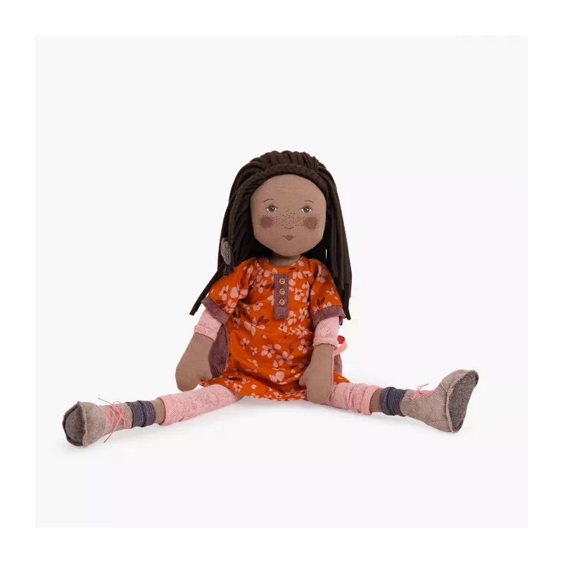 Grande poupée de chiffon Camélia, métis au doux visage illustré et imprimé, avec de longs cheveux en jersey rouleauté surmontés d'une jolie tresse. Elle est chaussée de bottines à lacets, et vêtue d'une robe pep's à fleurs avec legging en dentelle.
