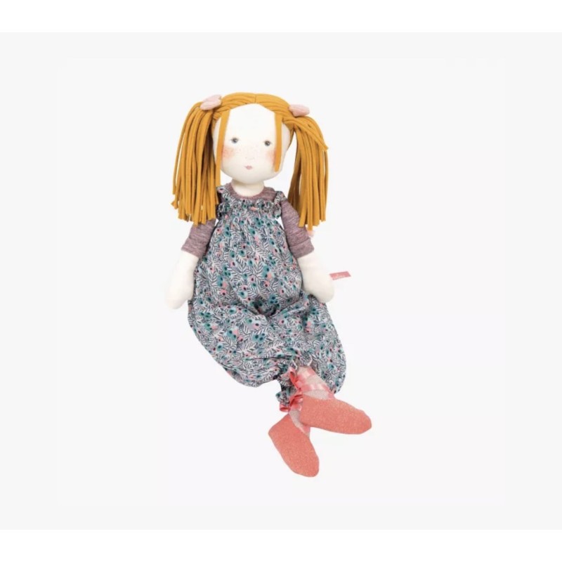 Pour le jeu et la déco : poupée de chiffon Violette, au doux visage illustré et imprimé, avec de longs cheveux blonds en jersey rouleauté. Elle est chaussée de babies pailletées avec rubans de satin et vêtue d'un pantalon ample et léger aux motifs champêtres.