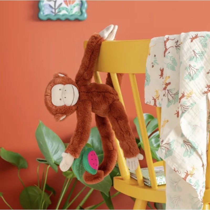 Voilà Mochica, le singe farceur aux multiples activités : glong fait la clochette, dilling les grelots et scritch la feuille. Avec ses attaches velcro, positionnez-le où vous le voulez ! Tout doux, il fera le bonheur des enfants pour de tendres câlins