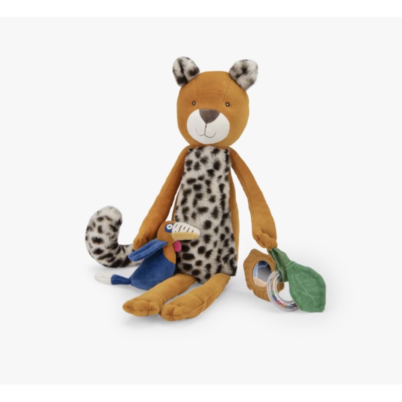 Mais qui voilà ? C'est Taïgo le léopard espiègle prêt à jouer à de nombreuses activités ! Anneau à billes colorées, grelots, feuille qui fait scritch, miroir ou encore Litchi le calao à manipuler. Tout pour découvrir le monde!
