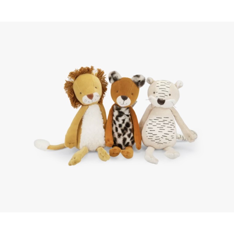 L'espiègle léopard Taïgo ne demande qu'à faire des câlins ! Avec sa fourrure tâchetée toute douce et son corps longiligne, il se blottira parfaitement aux côtés des plus petits. Il loge dans une boîte joliment illustrée à l'aquarelle par Élodie Coudray.