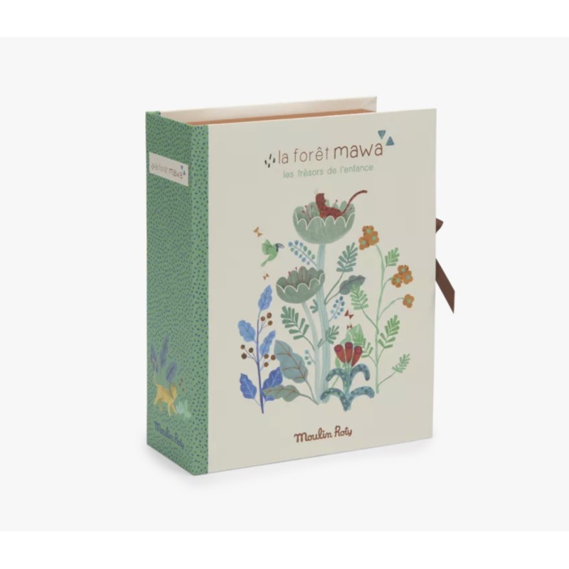 Coffret à trésors rigide pour conserver précieusement tous les trésors de l'enfance dans ses petits tiroirs. Se referme avec des liens et reprend les délicates illustrations des personnages de la forêt Mawa signées Élodie Coudray.