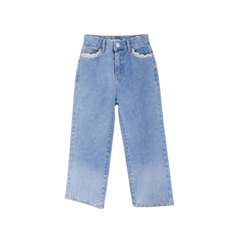 Jean bleu, coupe large, ceinture réglable, détails strasse à l’avant et broderies