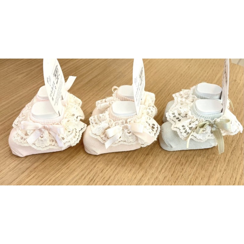 Chaussettes dentelle sur le haut et petit noeud sur le côté.