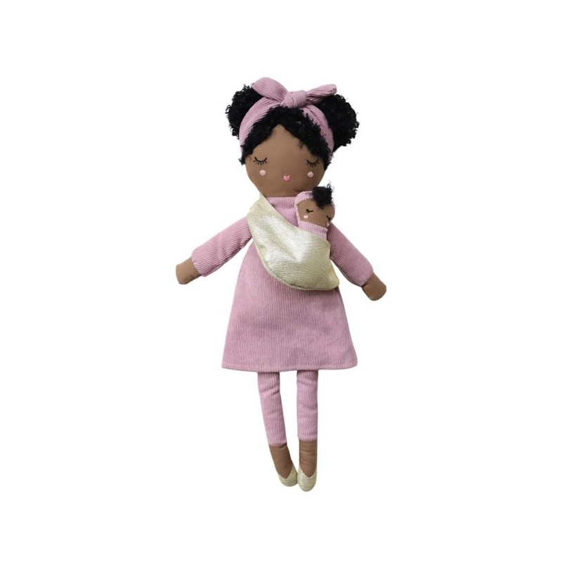 Les cheveux frisés de cette poupée chiffon vont vous faire craquer ! La douce poupée en tissu Maman Nicole porte fièrement son bébé dans un joli porte-bébé assorti. Avec son teint métisse, son sourire bienveillant et ses détails soignés, elle incarne une maman chaleureuse et aimante, prête à accompagner les tout-petits dans leurs jeux et câlins du quotidien.