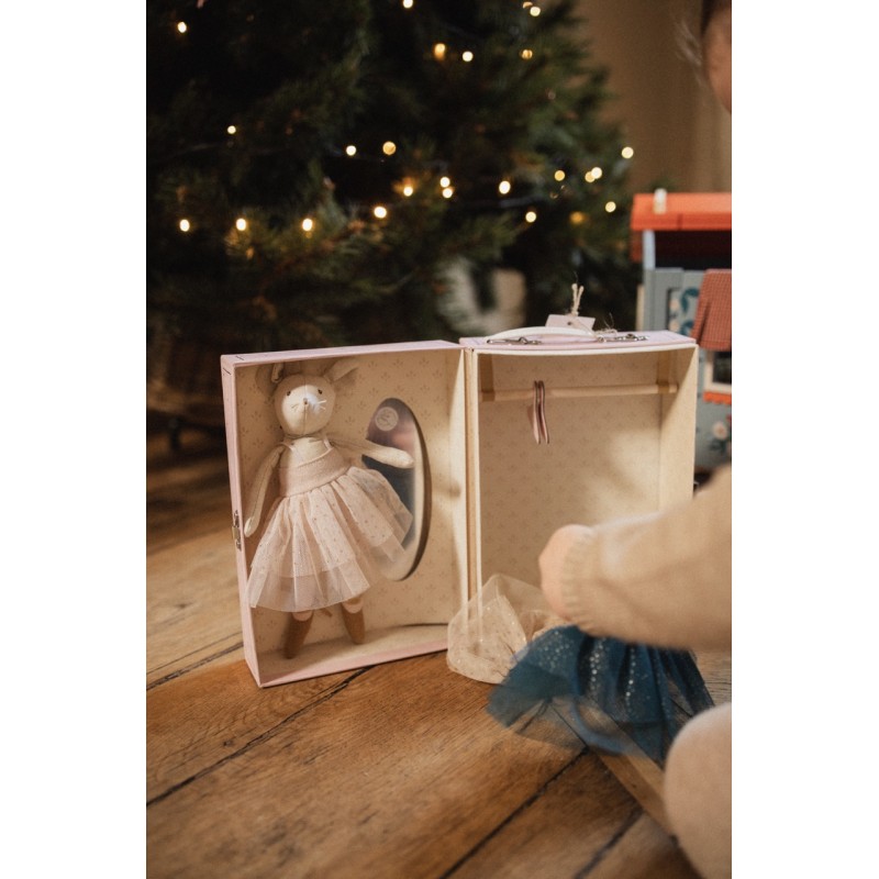 Une valisette armoire avec miroir intégré qui comprend 3 robes tutu (étoile, nacre, luxe) sur cintre.