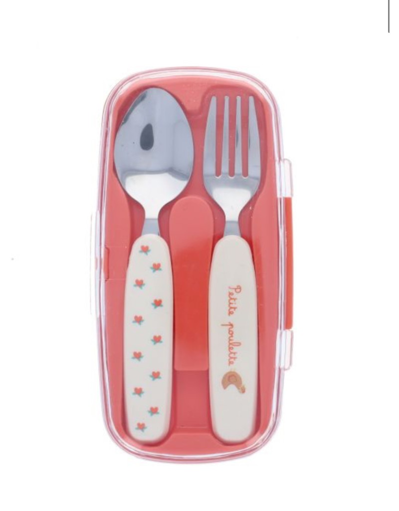 En acier inoxydable et en plastique, ce set de couverts enfant comprend une cuillère et une fourchette et se trouve à l'intérieur d'un petit étui de transport pratique. Avec sa petite poule dessinée, ce set va vous faire craquer !